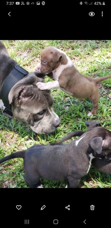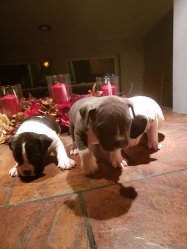The parents are ABKC and UKC registered. They are sired from the champion Gottylines and Kratos. Puppies will be registered ABKC. Our puppies are examined and vaccinated by a licensed veterinarian before they move to their new homes. Our puppies are raised and treated with all of the love and respect of family members. They receive top quality care and special attention from the moment they are born.